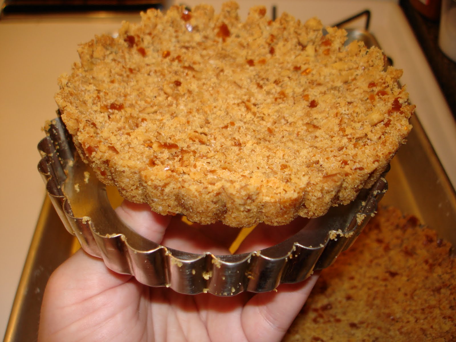 Divide the crumbs evenly between 3 5″ tart shells or 1 8″ shell. You will need the tart forms that have a removable bottom. Press the crumbs firmly around the sides, being careful to cover completely and evenly coat the bottom. The crumbs should be evenly distributed along the sides and the bottom so that the crust is even all around.